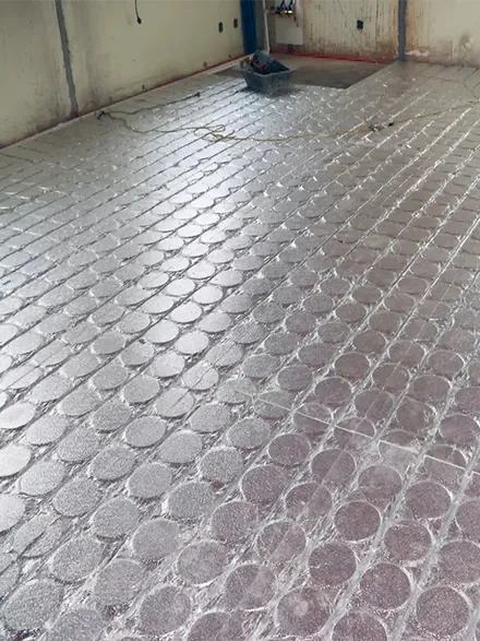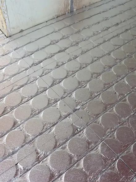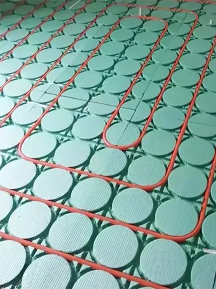 바닥 난방 파이프는 유 모양의 홈에 삽입되어 파이프가 고르게 스트레스를 받고 물 흐름이 방해받지 않도록 통합됩니다.