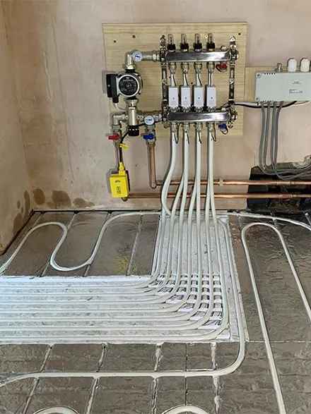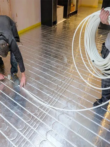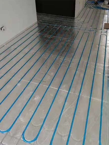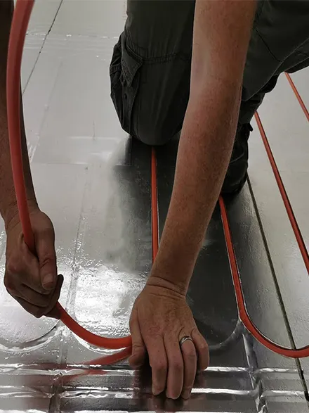 바닥 난방 파이프는 유 모양의 홈에 삽입되어 파이프가 고르게 스트레스를 받고 물 흐름이 방해받지 않도록 통합됩니다.