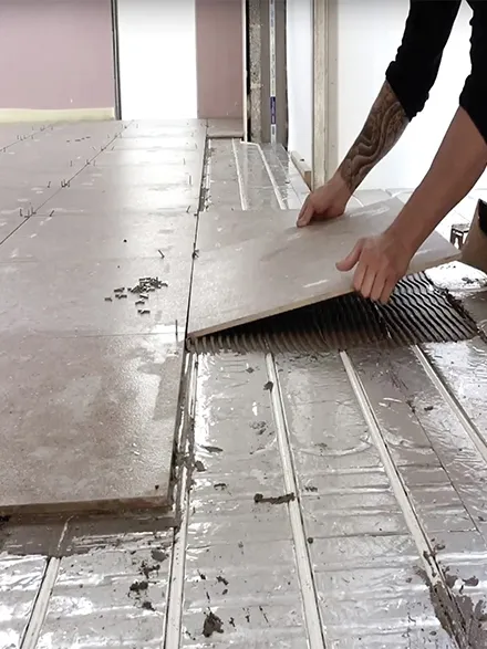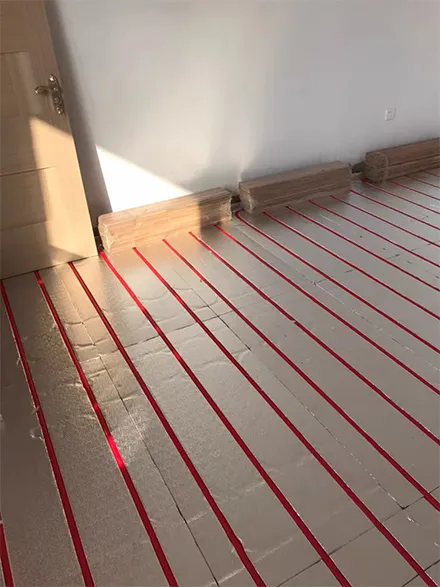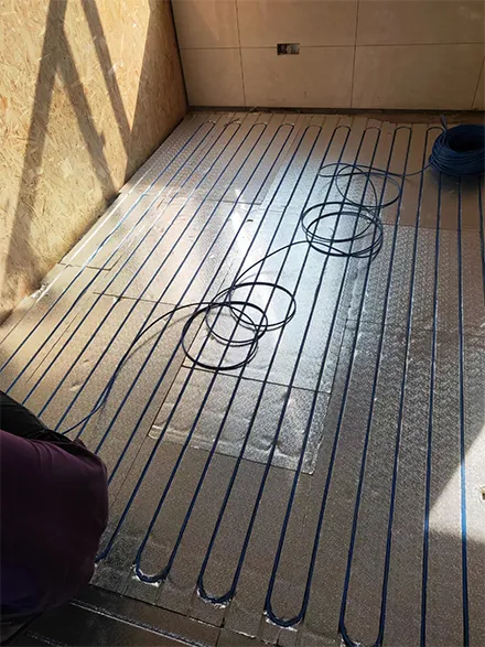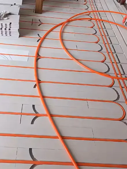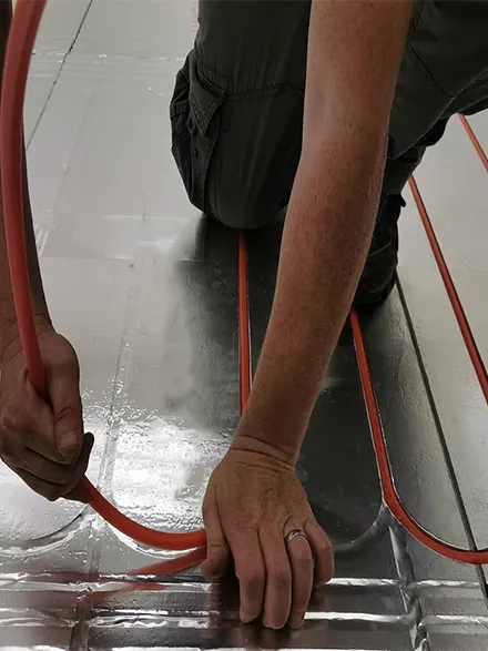 바닥 난방 파이프는 유 모양의 홈에 삽입되어 파이프가 고르게 스트레스를 받고 물 흐름이 방해받지 않도록 통합됩니다.